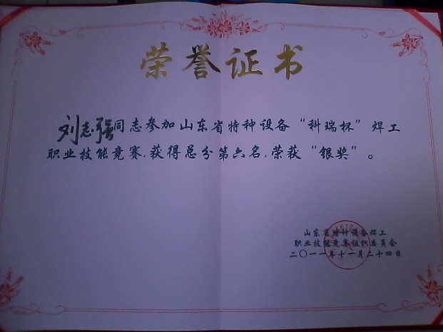 2011年11月參加山東省特種設備“科瑞杯”焊工技能競賽取得第六名,獲得銀獎。